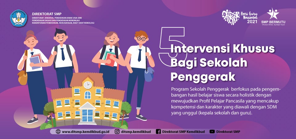 Nah, itulah dia 5 (lima) intervensi yang diberikan bagi sekolah penggerak. Jadi, bagi Sobat SMP yang ingin merasakan manfaat dari intervensi tersebut, jangan ragu untuk mengikuti seleksi Program Sekolah Penggerak angkatan selanjutnya ya. Mari bergerak dengan hati, pulihkan pendidikan.