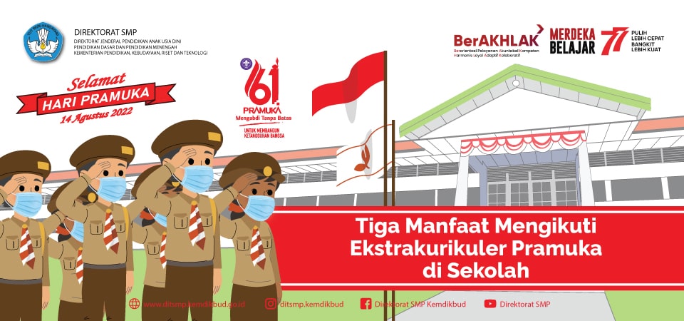 Gerakan Pramuka diresmikan melalui Keputusan Presiden Nomor 238 Tahun 1961 yang kemudian diperbarui melalui Undang-Undang Nomor 12 Tahun 2010. Saat ini, pramuka menjadi salah kegiatan ekstrakurikuler wajib bagi pelajar jenjang SMP. Dalam rangka memperingati Hari Pramuka, Direktorat SMP ingin mengajak Sobat SMP untuk memahami apa manfaat mengikuti ekstrakurikuler pramuka di sekolah. Apa sajakah itu?
