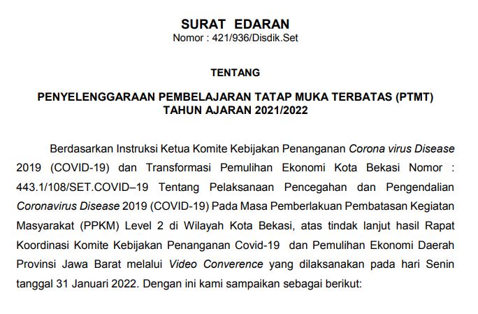Berdasarkan Instruksi Ketua Komite Kebijakan Penanganan Corona virus Disease 2019 (COVID-19) dan Transformasi Pemulihan Ekonomi Kota Bekasi Nomor : 443.1/108/SET.COVID–19 Tentang Pelaksanaan Pencegahan dan Pengendalian Coronavirus Disease 2019 (COVID-19) Pada Masa Pemberlakuan Pembatasan Kegiatan Masyarakat (PPKM) Level 2 di Wilayah Kota Bekasi, atas tindak lanjut hasil Rapat Koordinasi Komite Kebijakan Penanganan Covid-19 dan Pemulihan Ekonomi Daerah Provinsi Jawa Barat melalui Video Converence yang dilaksanakan pada hari Senin tanggal 31 Januari 2022. Dengan ini kami sampaikan sebagai berikut: